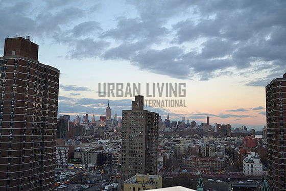 The bedroom to rent is furnished with a double size bed, two dressers, a TV and a closet. It has wood floors and a window overlooking the wall of the building and a piece of Manhattan.