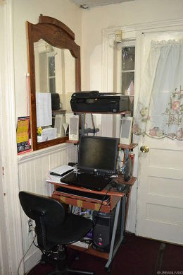 The bedroom for rent is located on the parlor floor and provides a single size bed, a closet, a dresser and a TV. Also, it has carpeting floors and a window overlooking the backyard.