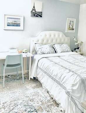 Private bedroom for rent has beige carpeting, two windows decorated with matched curtains and a closet. It is furnished with a double day bed, bedside table, a coffee table and a chair. An extra queen size air mattress can be provided. The accommodation includes blankets, sheets and towels.