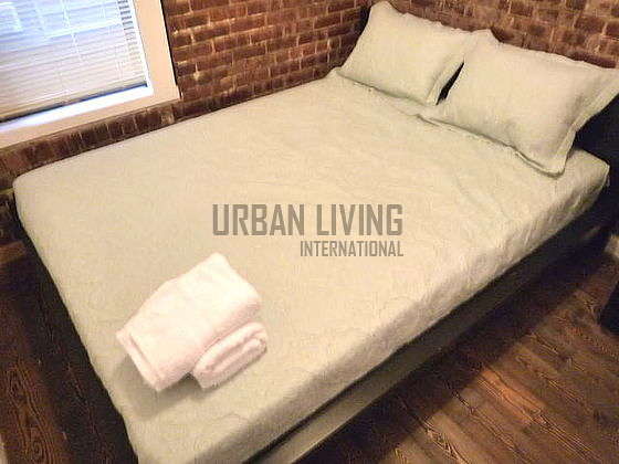 Enter the living room furnished with a sofabed for two people, a coffee table, a TV, a window facing the courtyard and a tasteful decoration. Next to the living room, the first and large bedroom offers a double size bed, a movable closet, a dresser, a desk with a chair, an air-conditioner, and two windows facing the street.