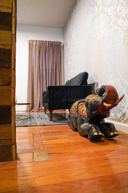 The living room, enlightened by two large windows with a high ceiling and a decorative fireplace, includes an armchair, a sofa and a coffee table. There is also a closet and a beside table.