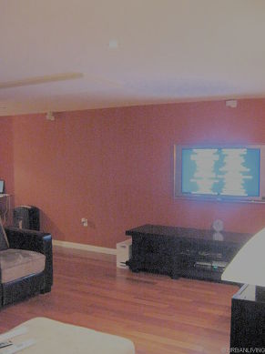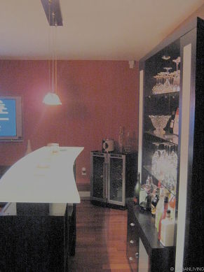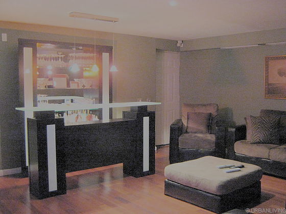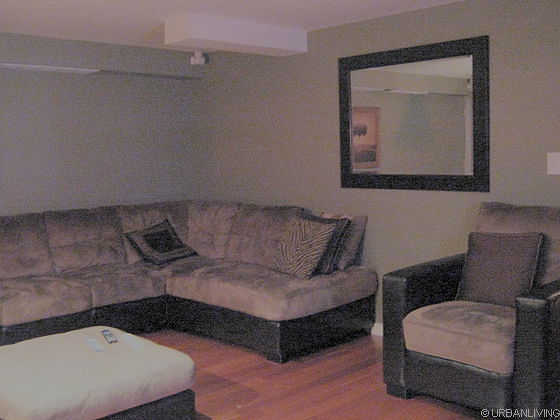 Downstairs, there is the laundry room. Then, there is the second living room, with 2 sofa, a TV, coffee table, and a bar.