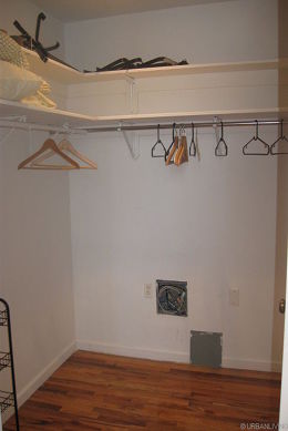 There are three large walk-in closets in the apartment. One of them has a washer and dryer.