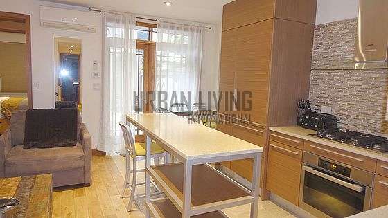 Located in a completely renovated landmark brownstone, this 2 bedroom /2 bath apartment, about 900 Square Feet with 700 Square Feet private back yard, is filled with unique high-end features, like radiant heat wood floor throughout, beautiful custom made kitchen with top of the line appliances and Structured Media Wired for Digital Cable and Multimedia Distribution and Entertainment, Intercom & Networking.