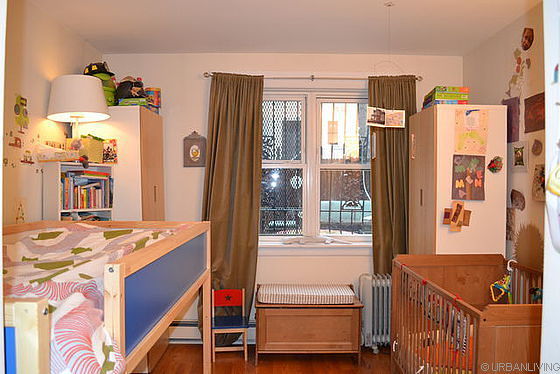 You enter the premises through a hallway that leads you on the right, to the first bedroom that is furnished with a king size bed, a queen size futon, a desk with a chair, a dresser and a piano. It has wood floors and a window overlooking the street.