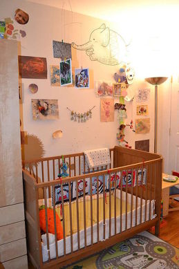 The open kitchen leads you to another hallway which gives access to the second full tiled bathroom equipped with a separate shower, a toilet and a sink. This hallway leads you to the second bedroom that is furnished with a single size children bed and a crib bed.