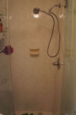 Next to the bedroom you can find the first tiled bathroom that has a bathtub with shower, a toilet and a sink.