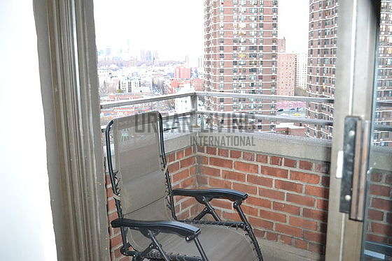 The bedroom to rent is furnished with a double size bed, two dressers, a TV and a closet. It has wood floors and a window overlooking the wall of the building and a piece of Manhattan.