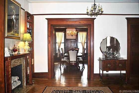 The spacious living room features hardwood floors, a sofa with two armchairs and a piano. This room leads into the parlor floor wich has a fireplace with bookshelves on the both sides.
