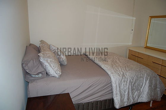 The first bedroom provides an AC, a queen size bed, a desk with a chair and two huge closets.